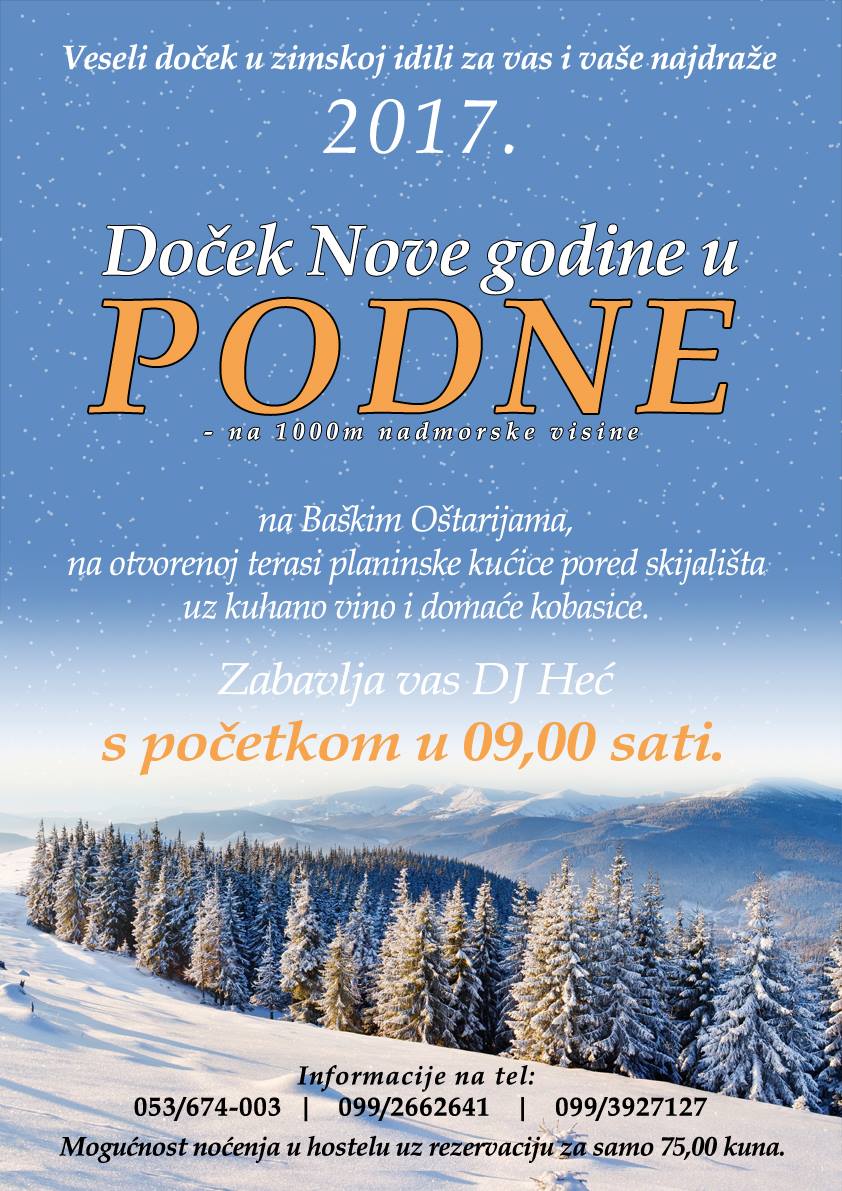 Sportski centar u Baškim Oštarijama ove godine priređuje doista originalan doček Nove godine. Da se ne bi inkomodirali ljubitelji fešta, planina i uopće dobroga ambijenta, poduzeće „Vegium“ iz Karlobaga u hostelu priređuje doček 2017. godine 31. prosinca točno u podne!!! Fešta će započeti ujutro od  9 sati, a sve će „začiniti“ vrhunske delicije, dj “Heć” i tamburaši grupe „Velebit“.