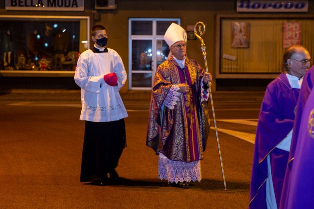 Večeras je u katedrali Navještenja blažene djevice Marije u Gospiću večernju misu pred mnoštvom vjernika predvodio gospićko-senjski biskup mons. Zdenko Križić, uz koncelebraciju 20-ak svećenika. Nakon svete mise formirana je procesija svećenika do adventskog vijenca postavljenog oko kipa Marte vodarice u centru Gospića.